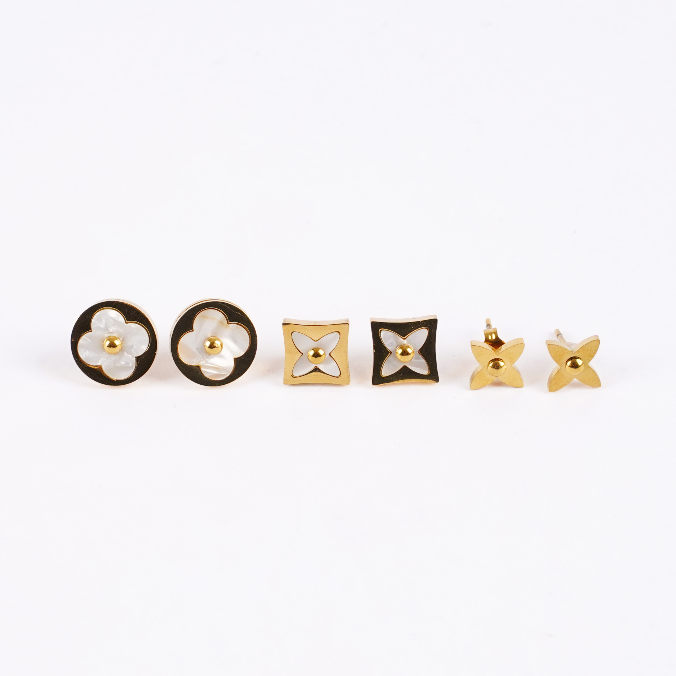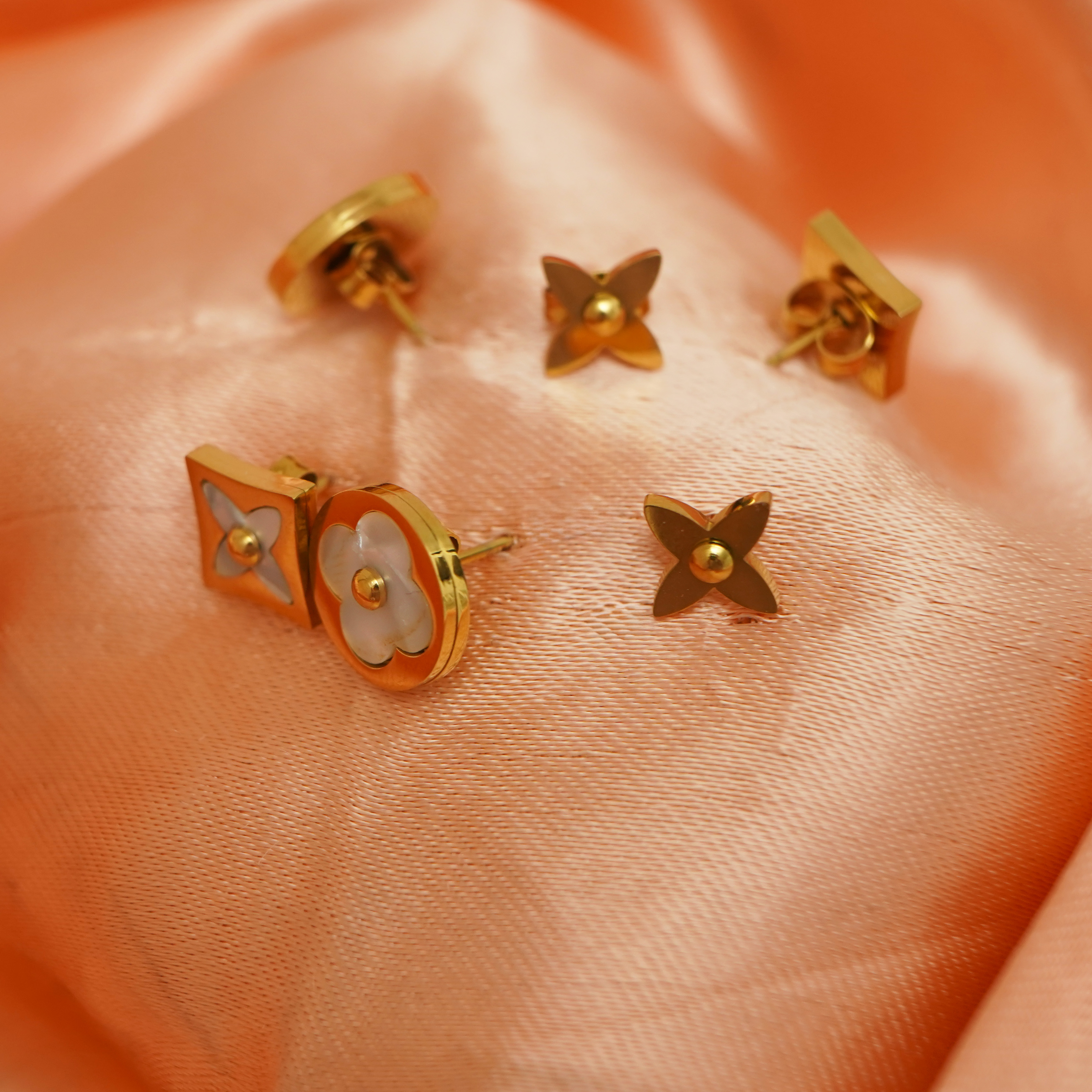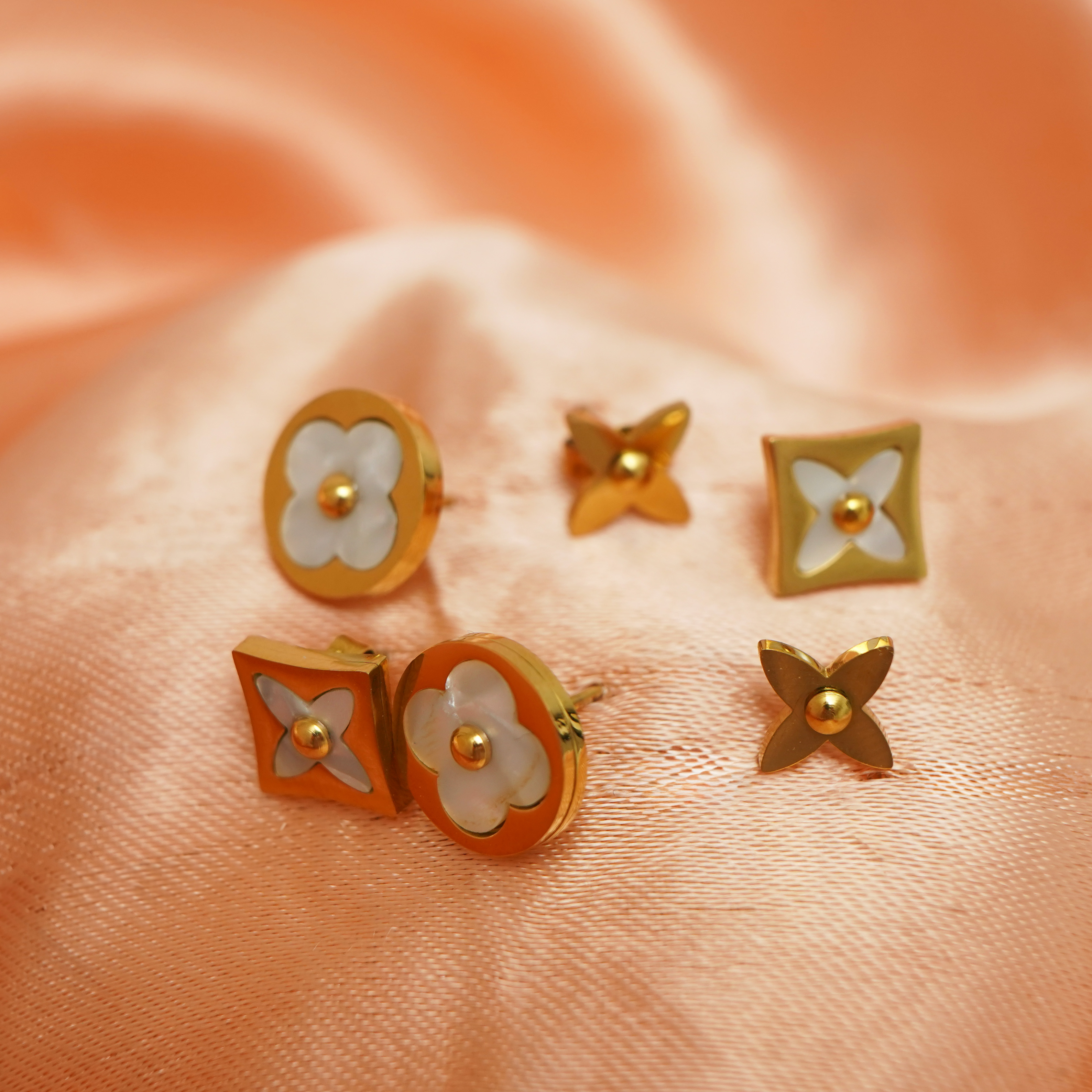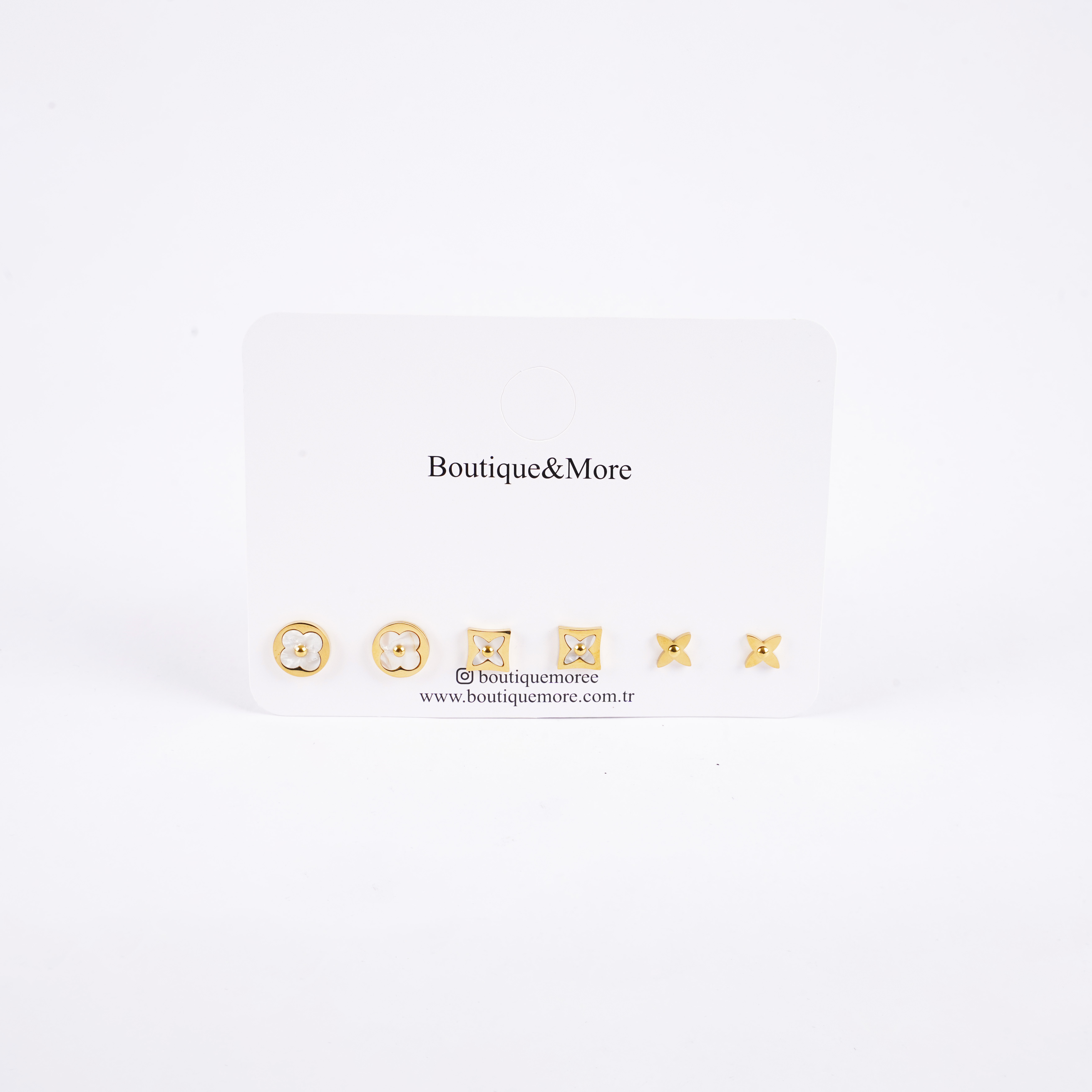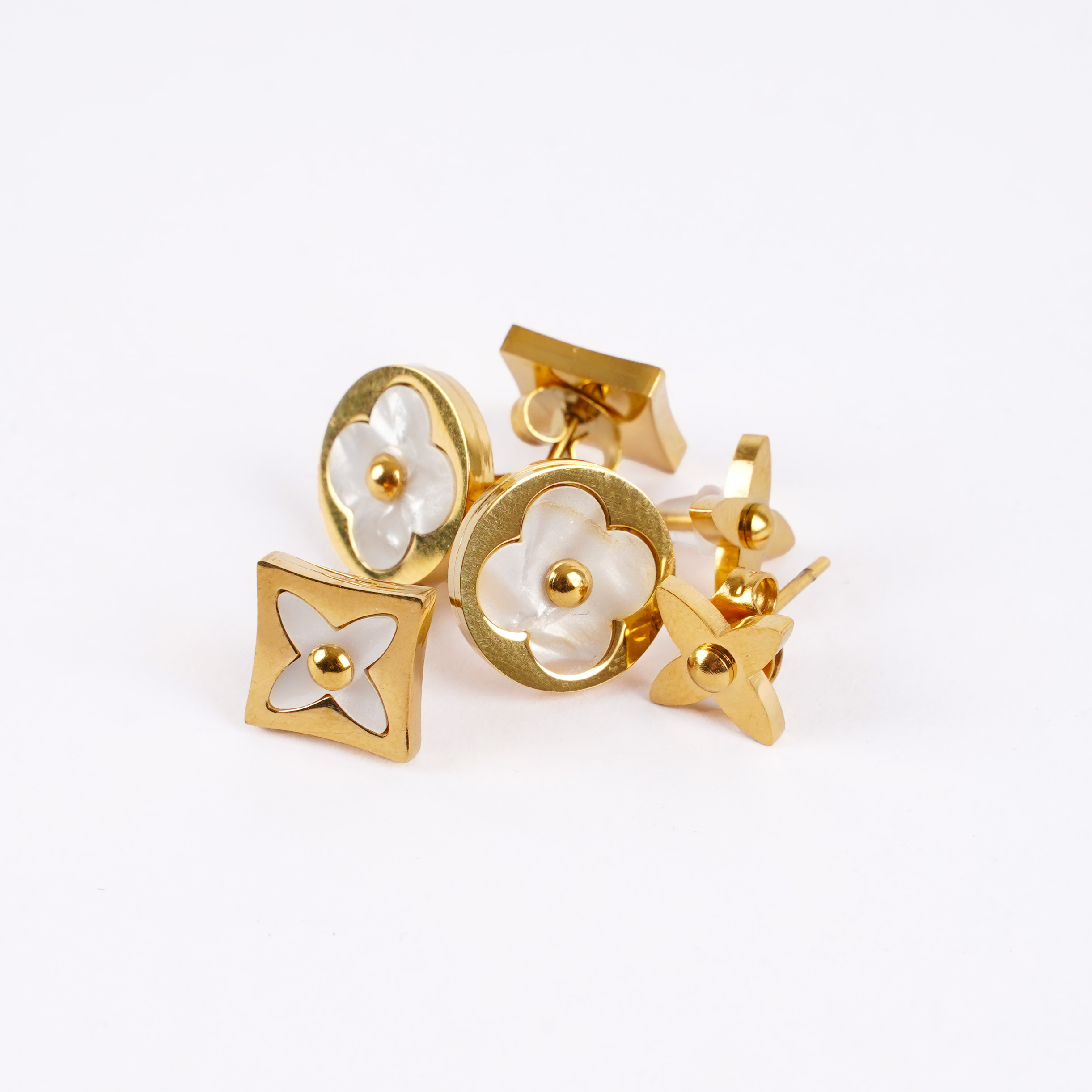 Zarif ve şık tasarımıyla öne çıkan bu altın kaplama çelik küpe seti, her kombine uyum sağlayacak şekilde tasarlandı. Sedef detaylarıyla parlayan çiçek figürleri, günlük ve özel günlerde zarafetinizi tamamlar. Paslanmaz çelik yapısı sayesinde uzun ömürlü kullanım sunar ve hassas ciltler için uygundur.