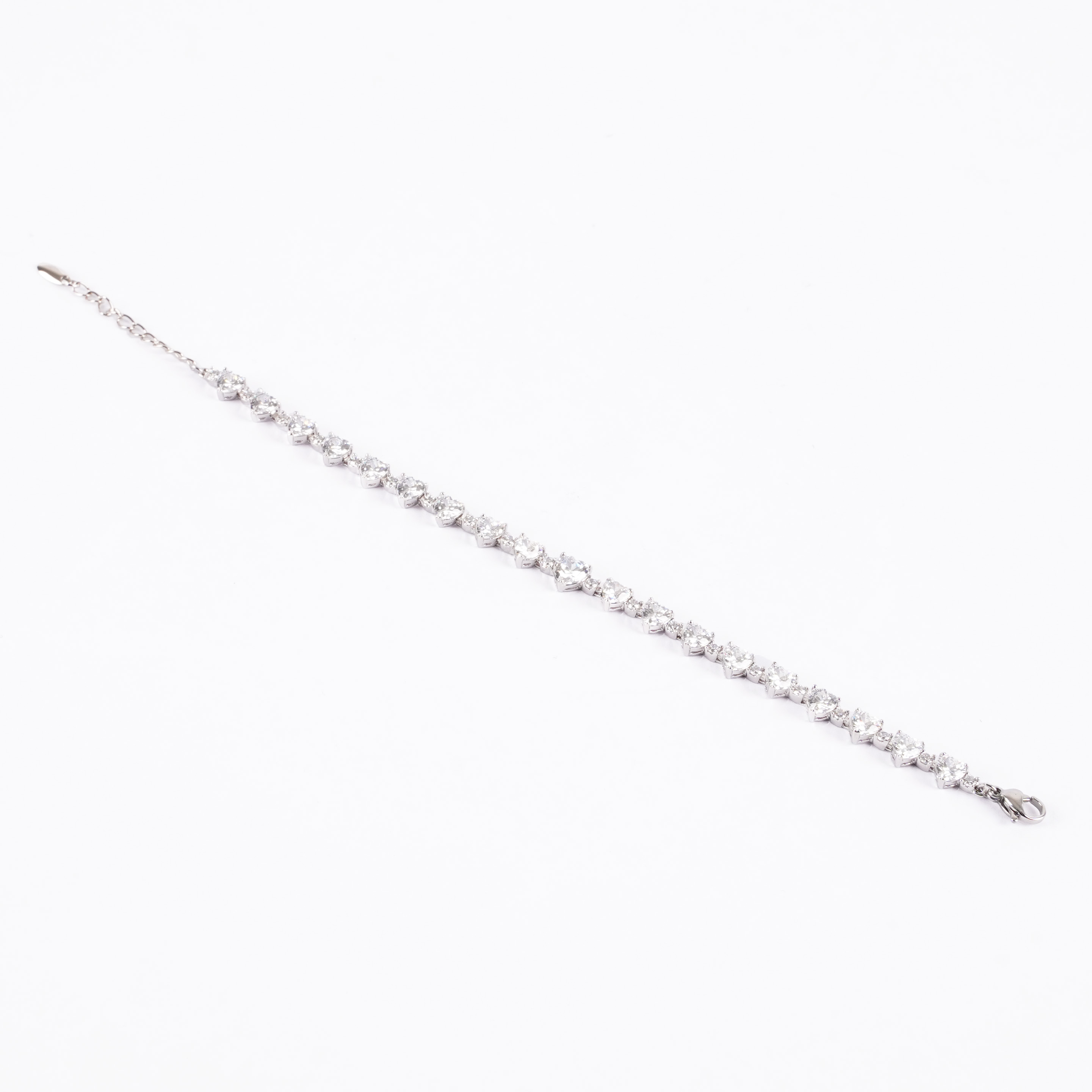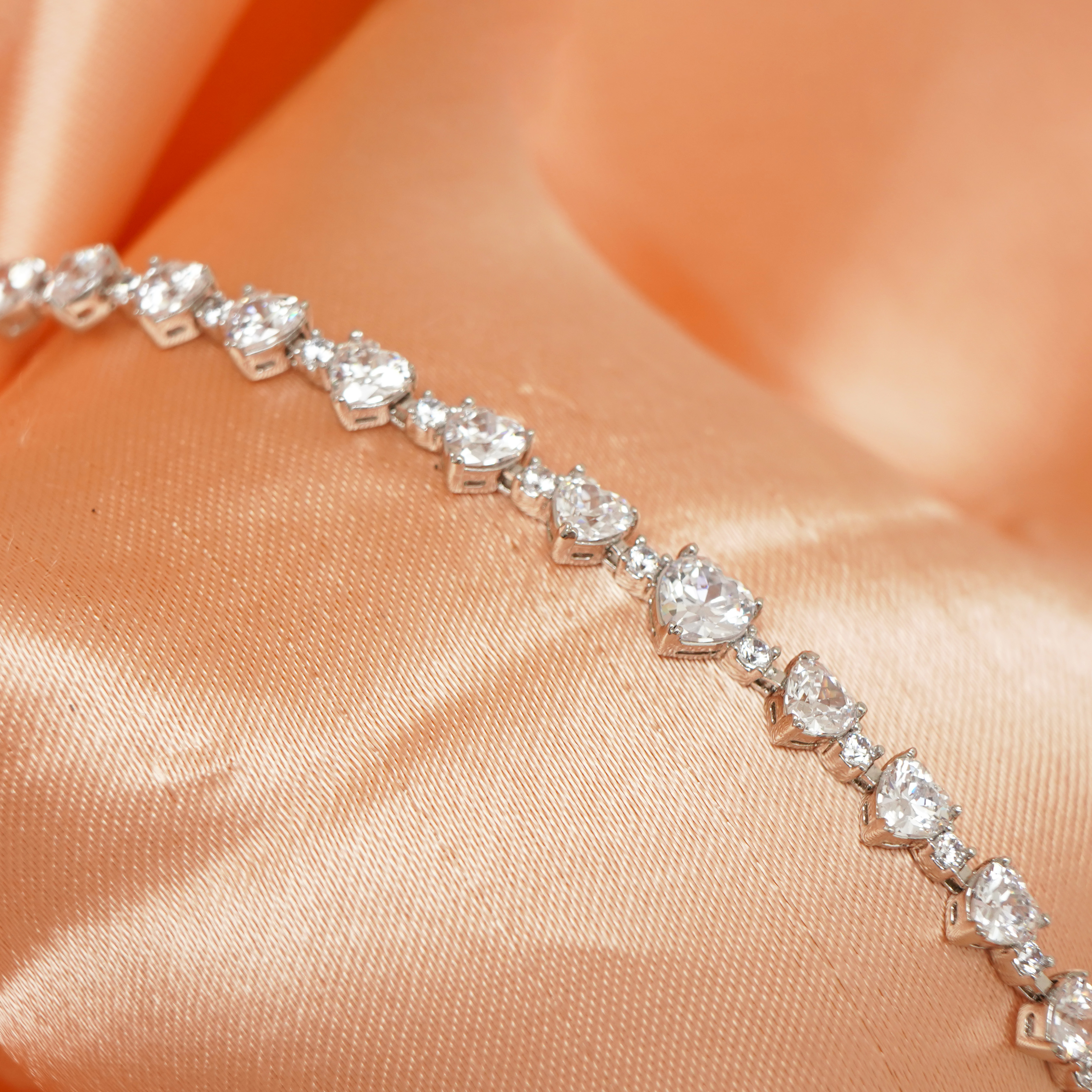 Art Deco döneminden ilham alan bu muhteşem tennis bilezik, emerald cut taşların geometrik güzelliğini mükemmel şekilde sergiliyor. Her taş dikdörtgen kesimi ile ışığı farklı açılardan yansıtarak büyüleyici bir parlaklık yaratır. Gümüş rengi ile soğuk ve elegant bir ton kazanan bilezik, klasik zarafetin modern yorumu olarak öne çıkıyor.