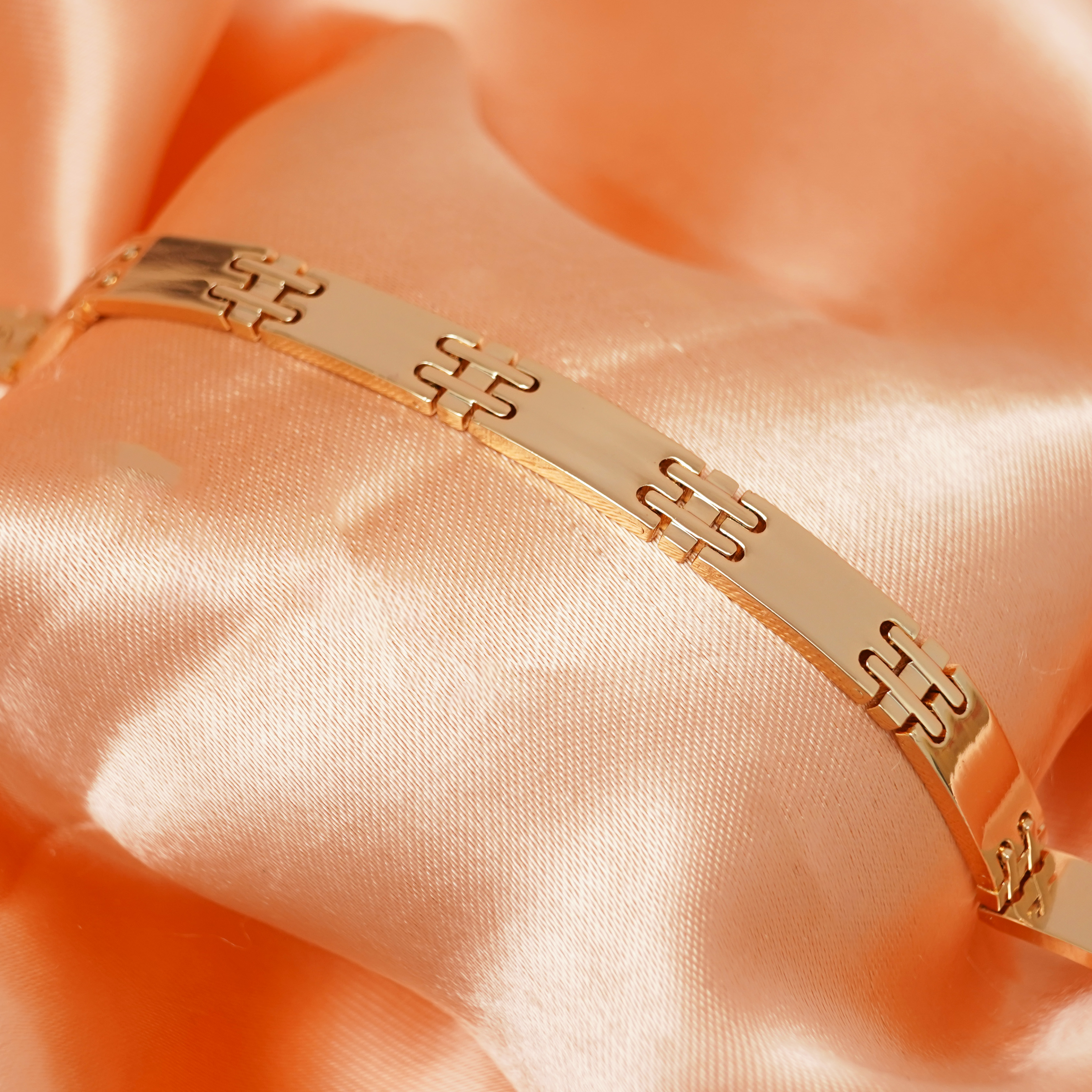 Çağdaş tasarım anlayışının zarif bir yansıması olan bu bilezik, geometrik oyma desenlerle modern sanatı bileğinize taşıyor. Rose gold sarısı kaplama ile sıcak ve romantik bir görünüm sunarken, cut-out detaylar ışık oyunları yaratarak dinamik bir etki sağlıyor. Minimalist çizgileri ile hem günlük hem de özel kombinlerde mükemmel uyum gösterir.