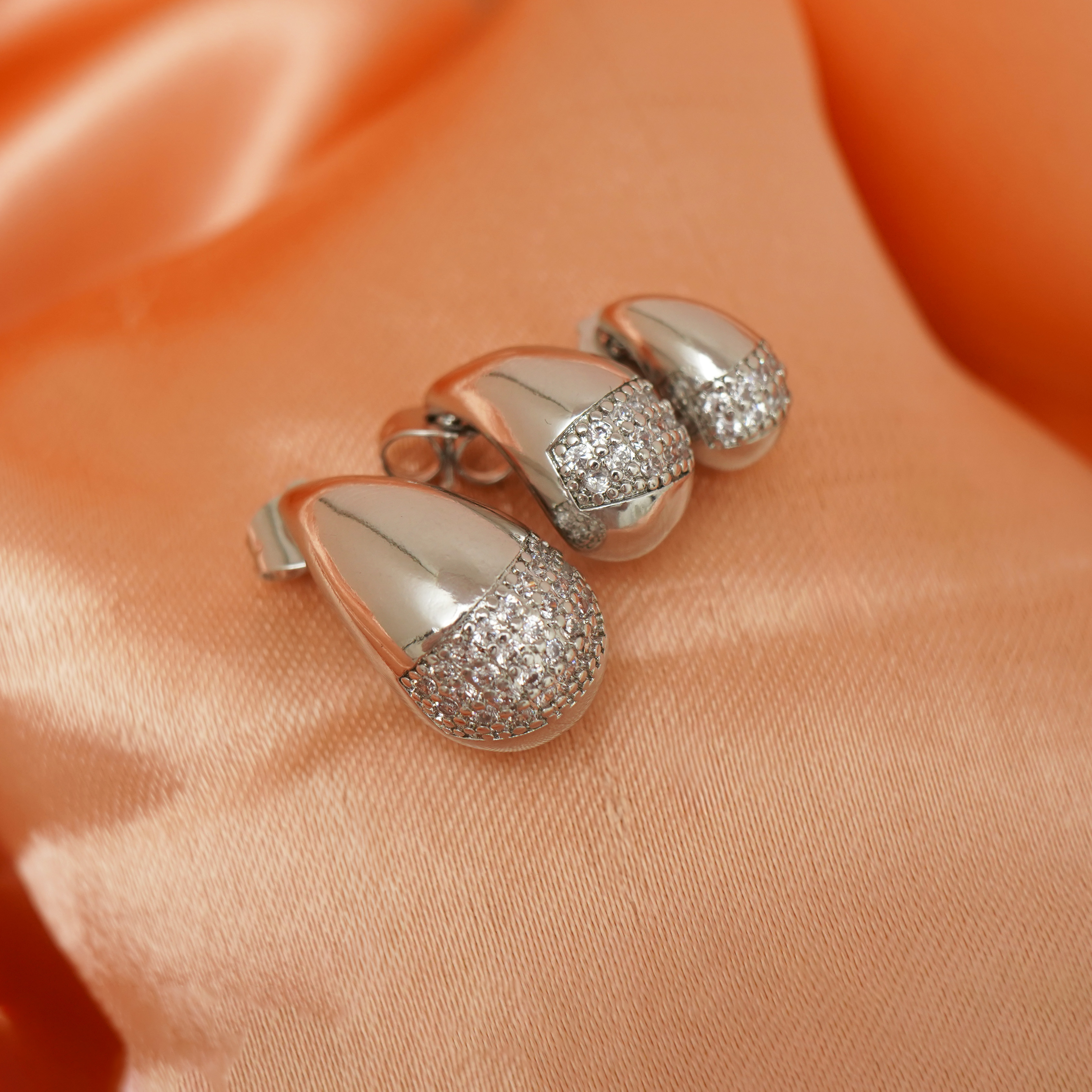 Zarif ve modern tasarımıyla dikkat çeken bu çelik küpe seti, parlak taş işlemeleriyle şıklığı ön plana çıkarıyor. Gümüş rengi paslanmaz çelikten üretilen küpeler, hem günlük kullanım hem de özel davetler için mükemmel bir tamamlayıcıdır. Hafif yapısı sayesinde gün boyu konfor sağlar.