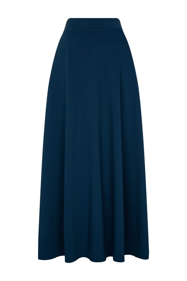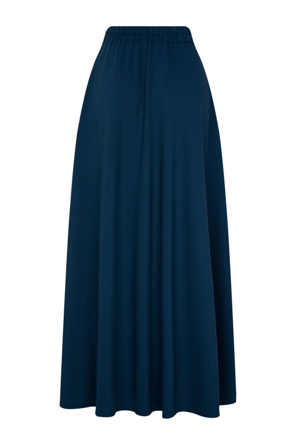 Verev kesim, etek arka beli lastikli, yandan fermuarlı, yandan gizli cep detaylı, dokuma krep kumaş.