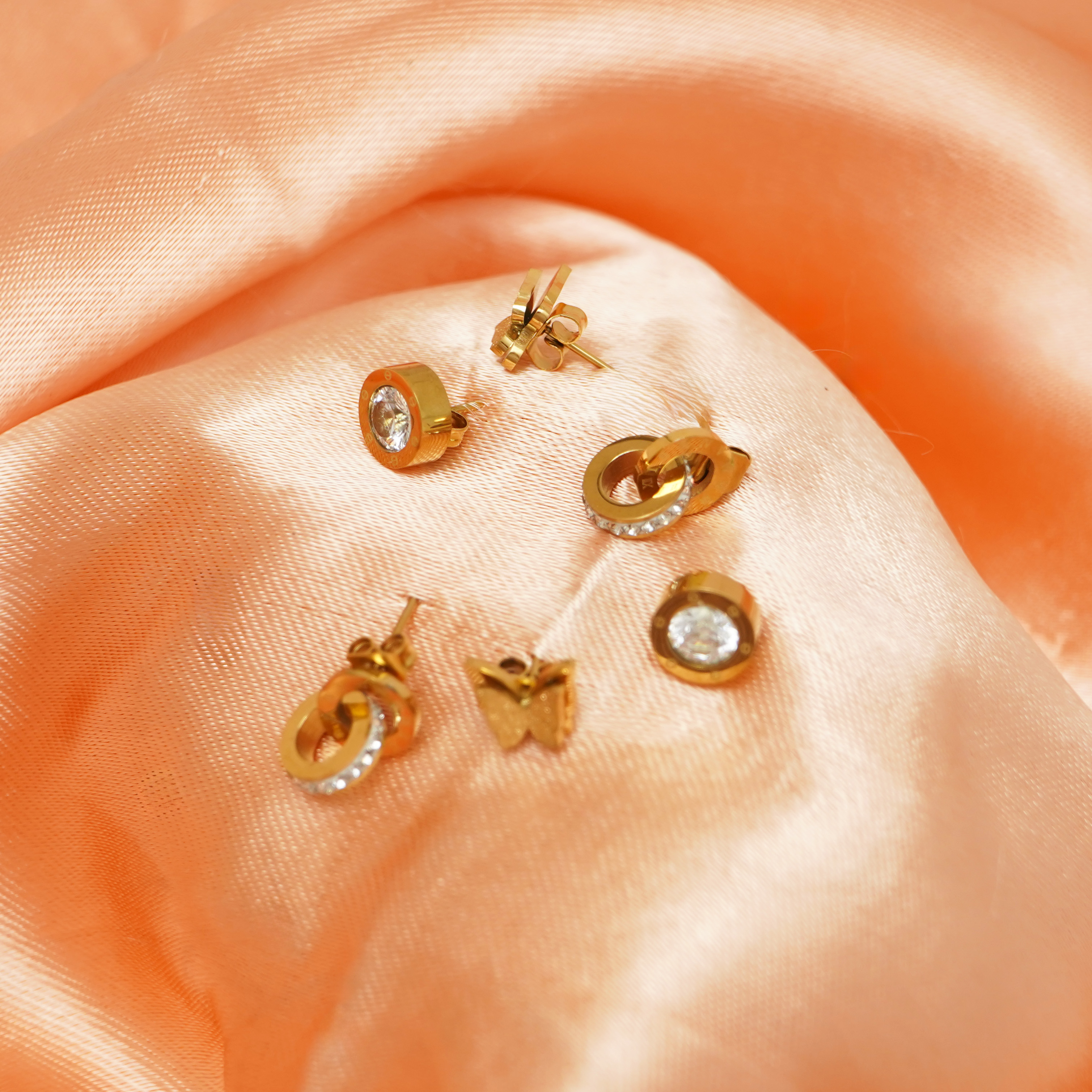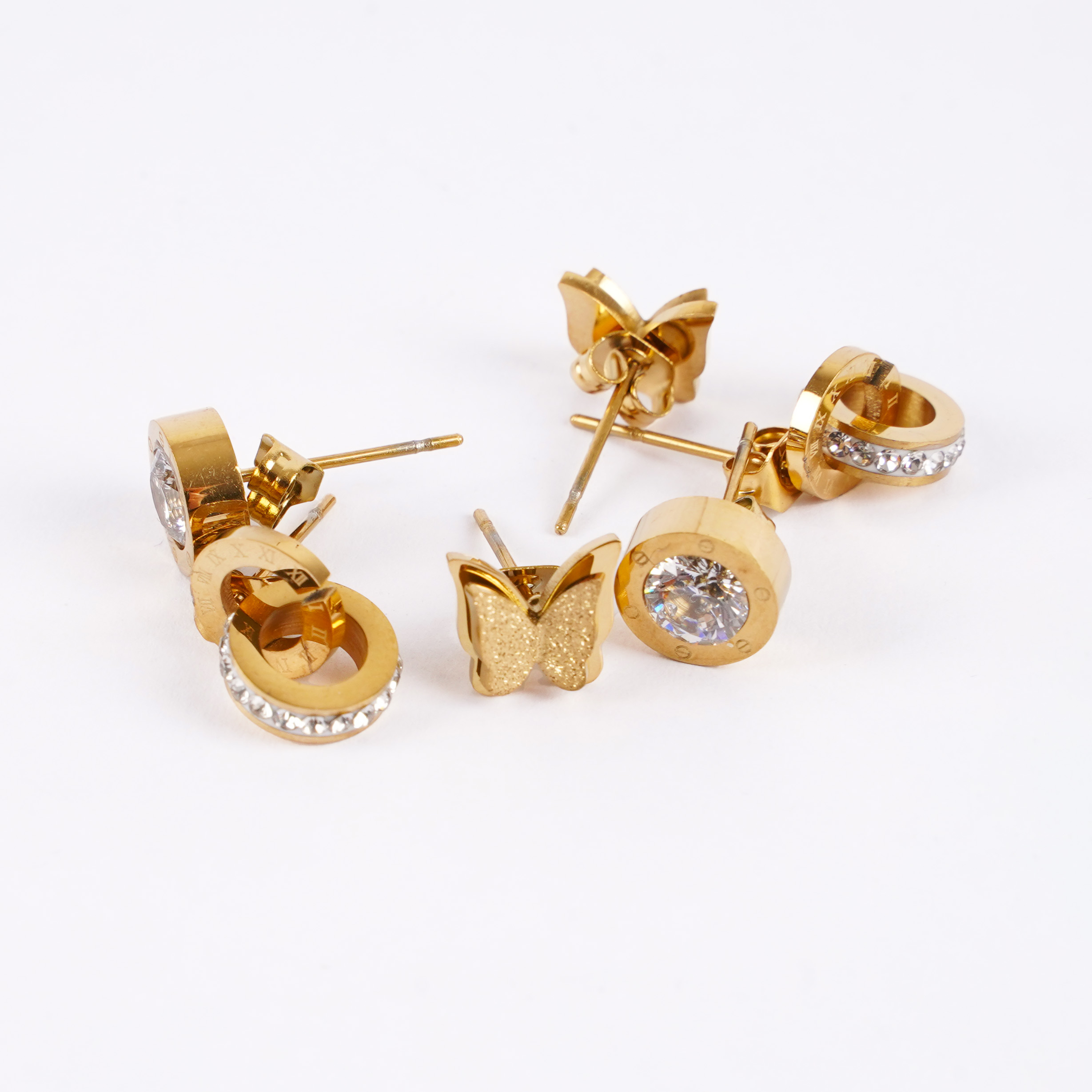 Şıklığınızı tamamlayacak bu gold küpe seti, farklı tasarımlarıyla her stile uyum sağlar. Kelebek motifleri, parlak taş detayları ve modern halka tasarımıyla özel günlerde ve günlük kullanımda zarafetinizi ön plana çıkarın. Hipoalerjenik yapısı sayesinde hassas ciltler için de uygundur.