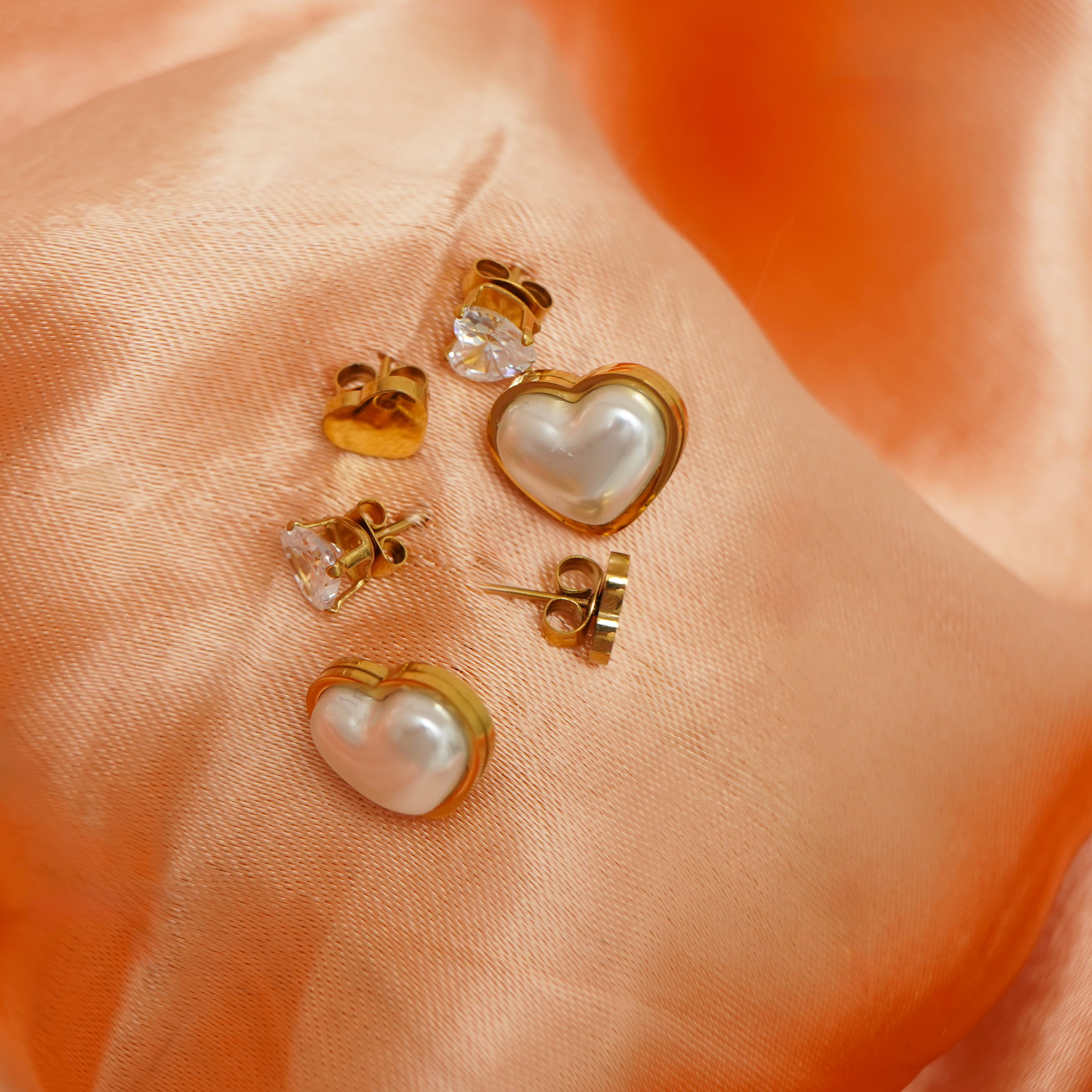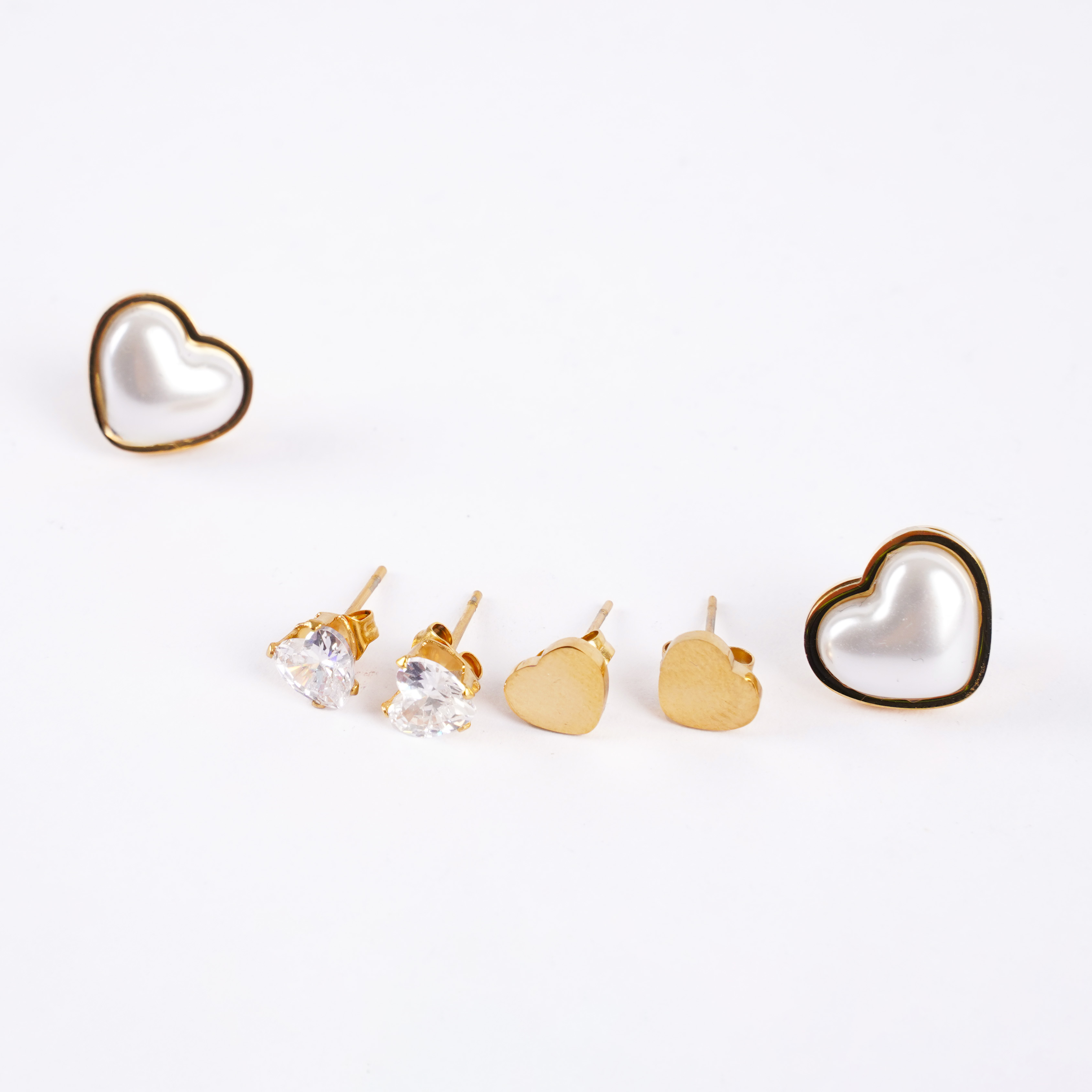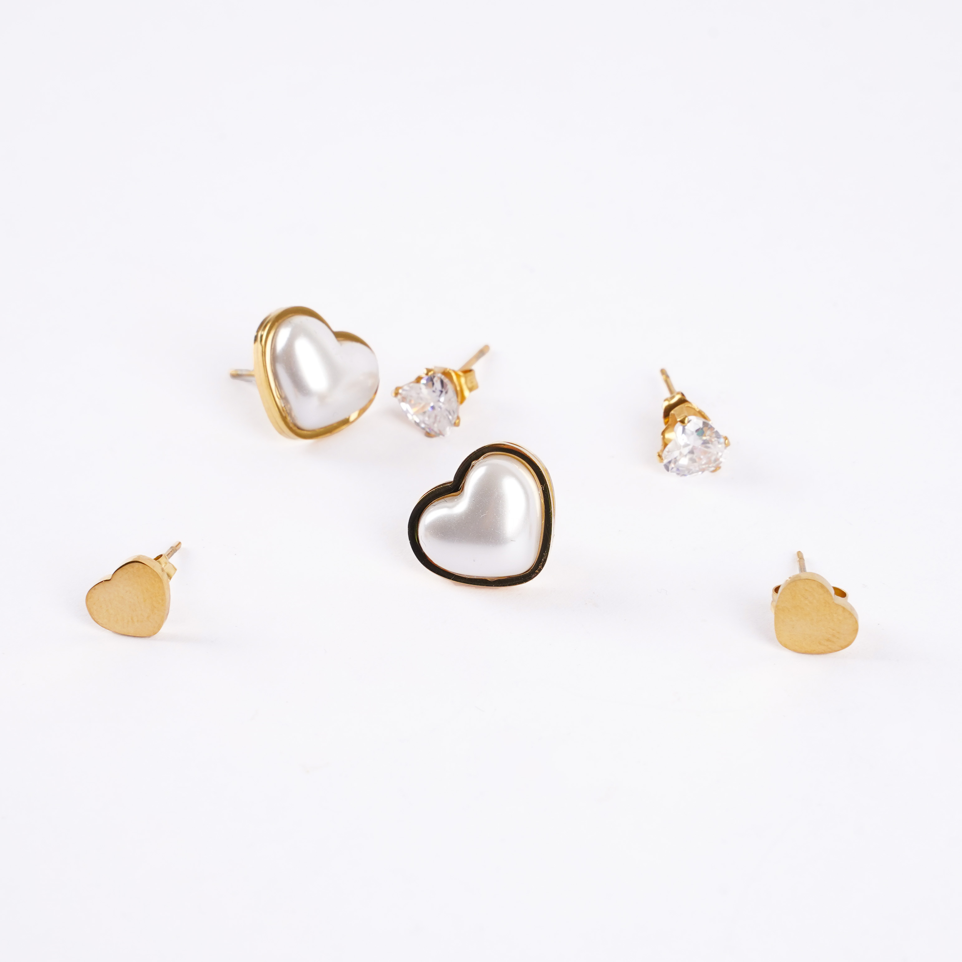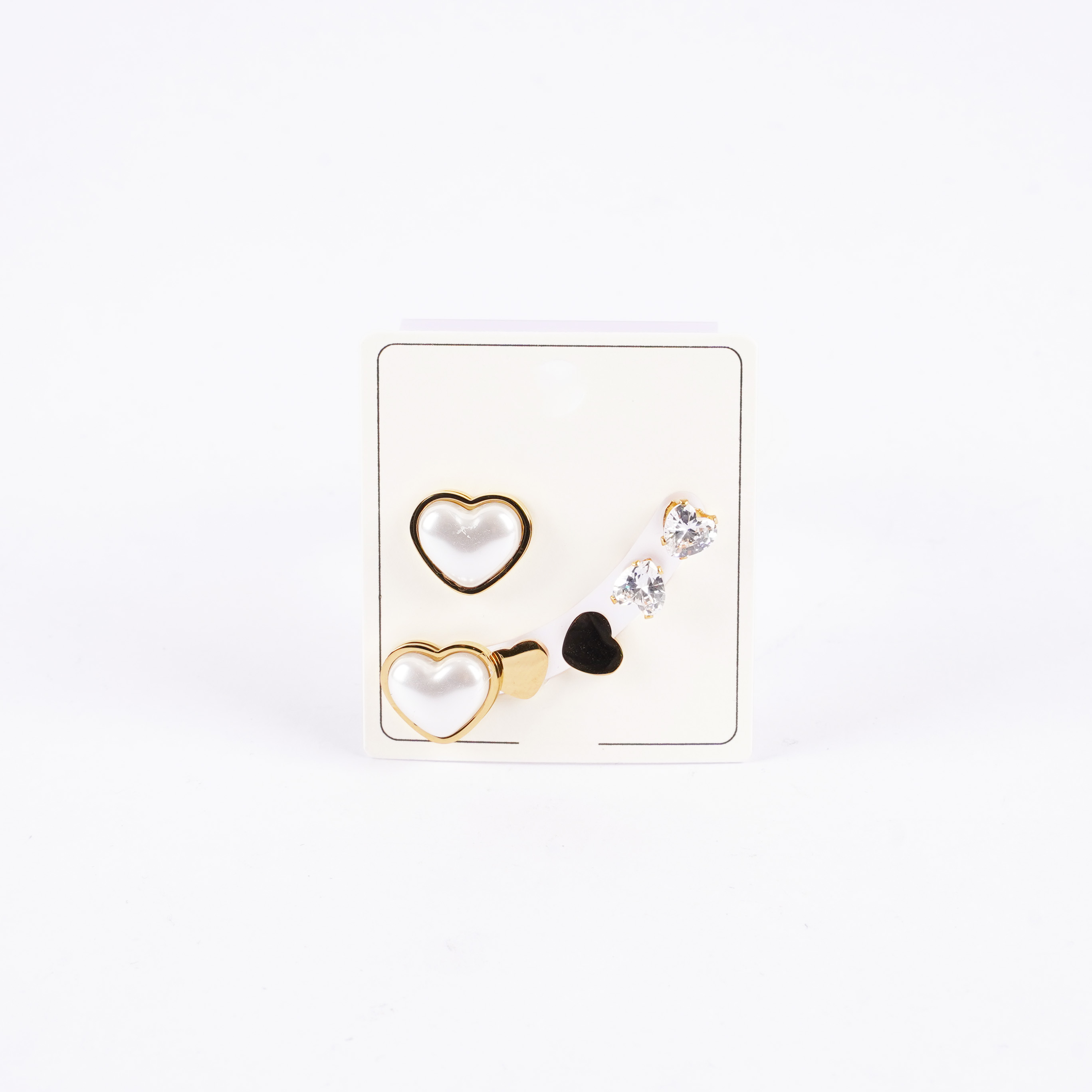 Farklı kalp motiflerinden oluşan bu şık küpe seti, inci ve taş detaylarıyla romantik bir görünüm sunar. Günlük kullanımda veya özel anlarda stilinize zarif bir dokunuş katmak için ideal bir aksesuardır. Hafif ve rahat yapısıyla gün boyu konfor sağlar.